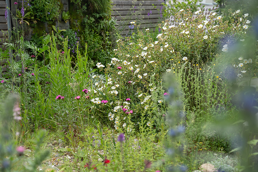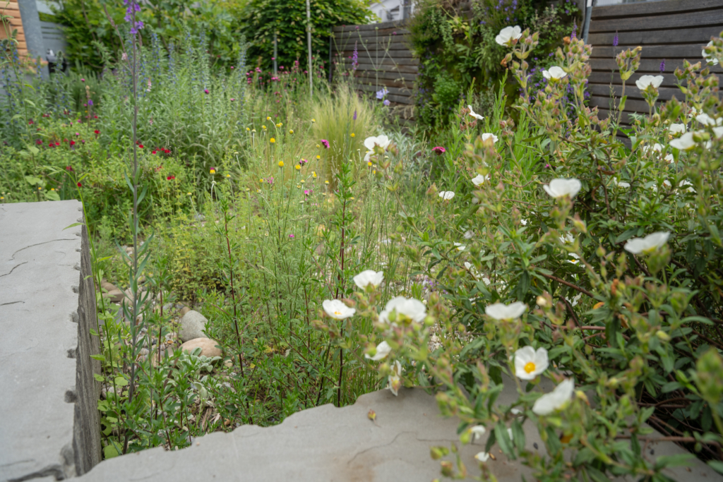 Die Sandsteinquader laden zum Verweilen ein und bieten einen perfekten Platz, um dem Summen und Brummen der zahlreichen Wildbienen und Schmetterlinge zuzuschauen. Als attraktiver Eyecatcher wurde neben den Sandsteinquadern eine Zistrose gepflanzt. Und das Beste daran? Der gesamte Garten ist pflegeextensiv gestaltet und bietet langfristige Freude ohne grossen Aufwand!