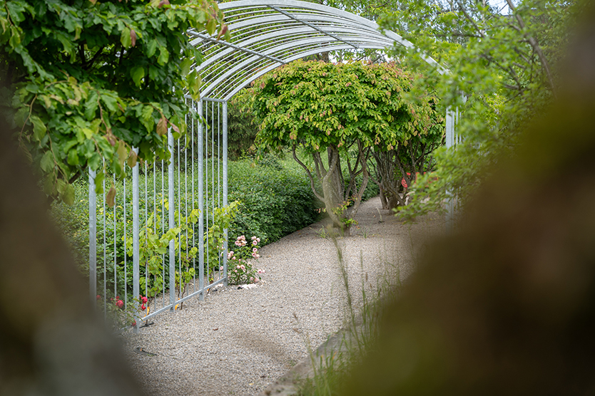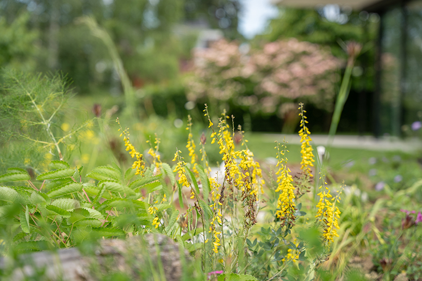 Totholzstämme und eine Sandlinse für bodennistende Wildbienen wurden ebenso in den Garten integriert wie eine Trockensteinmauer aus Valserquarzit, die von Mauereidechsen besiedelt wurde. Die zuvor gräserbetonte Wiesenböschung wurde durch Initialpflanzen aufgewertet. Ein großer Asthaufen bietet auch dem kleinen, stacheligen Vierbeiner, dem Igel, einen Unterschlupf. Viele Solitärsträucher geben dem Garten Struktur und Räume. Insbesondere der majestätische Blasenbaum im Eingangsbereich lässt sich bewundern; darunter findet sich eine Mischung mit vielen Blütenstauden.