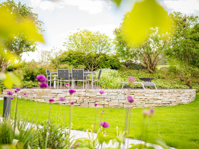 Der Rasen wurde komplett überarbeitet und eine Terrassierung mit Granitquadersteinen angelegt, die das Gelände strukturiert und zugänglich macht. Die neue Bepflanzung mit Gehölzen, Stauden, Gräsern und Zwiebelgewächsen verleiht dem Garten Farbe und Vielfalt zu jeder Jahreszeit. Eine Betonmauerverkleidung aus Fichtenholz bringt Natürlichkeit und Wärme ins Gesamtbild.