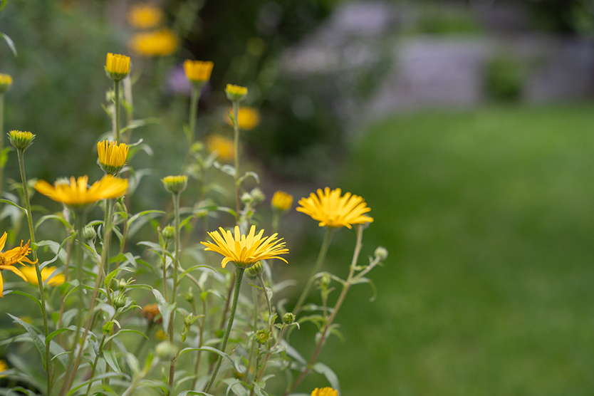 Eine abgestufte Trockensteinmauer aus Maggia-Gneis lädt zum Verweilen ein und dient quasi als Gartenbank. Die Pflanzflächen wurden ausschließlich mit heimischen Stauden bepflanzt, während die Sträucher aus dem alten Bestand erhalten blieben. Ein Rosenbogen, bepflanzt mit einer Kletterrose, markiert den Eingang zur kleinen Oase und verleiht dem Garten einen romantischen Touch.