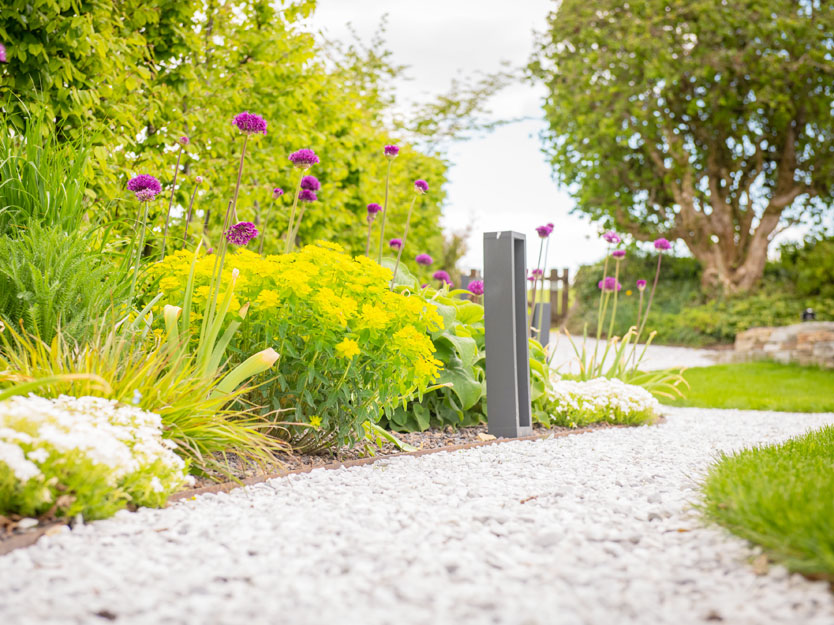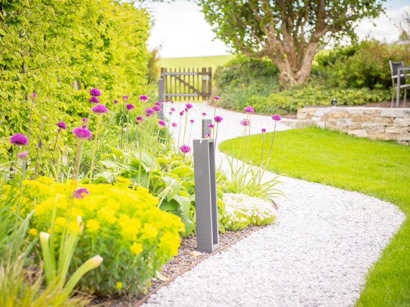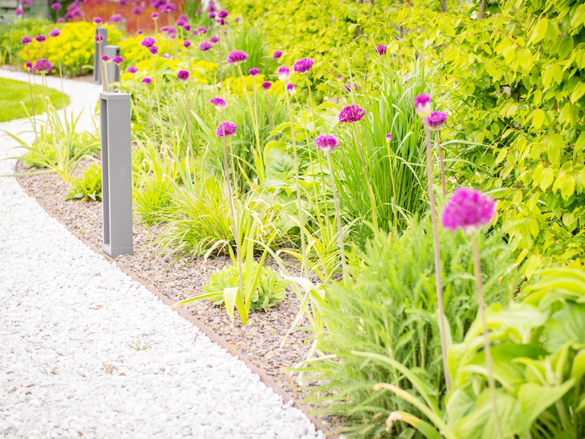 Ein geschwungener Kiesweg, der sanft durch den Rasen verläuft, schafft eine charmante Verbindung. Auf der einen Seite grenzt er an den gepflegten Rasen, während auf der anderen eine artenreiche Staudenbepflanzung für farbenfrohe Akzente sorgt. Diese Bepflanzung lockt zahlreiche Insekten an und sorgt fast das ganze Jahr über für ein lebendiges Blütenmeer.
