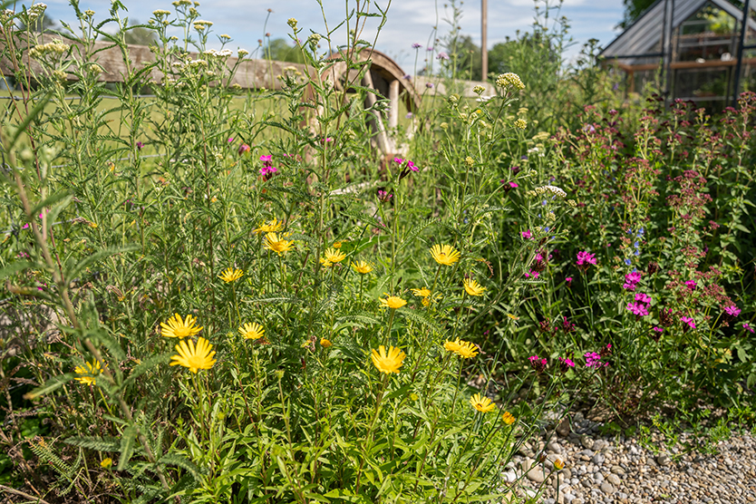 Die Kundschaft übernahm den bestehenden Schrebergarten und veranlasste eine umfassende Neugestaltung. Die ursprünglich zu grossen Betonplattenflächen wurden reduziert, um Platz für eine vielfältige Bepflanzung zu schaffen. Die Betonplatten fanden eine neue Verwendung als Sitzmauer, die den gemütlichen Kiesplatz mit Feuerschale umgibt. Ein Teil der Gemüsebeete wurde zugunsten einer blühenden Blumenwiese umgestaltet, die nun mit ihrer Farbenpracht und Artenvielfalt begeistert. Eine Ruderalfläche mit heimischen Pflanzen rundet die ökologische Aufwertung ab und bietet Lebensraum für zahlreiche Tierarten.