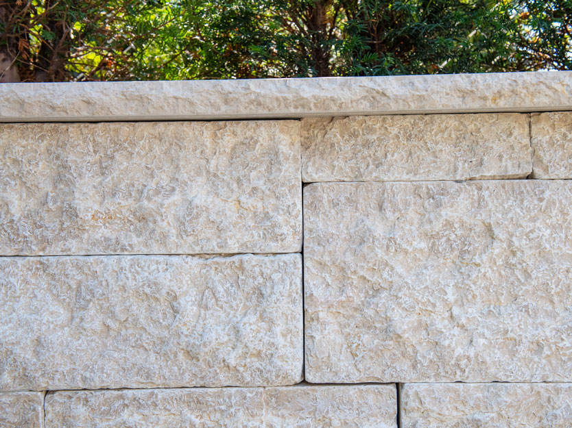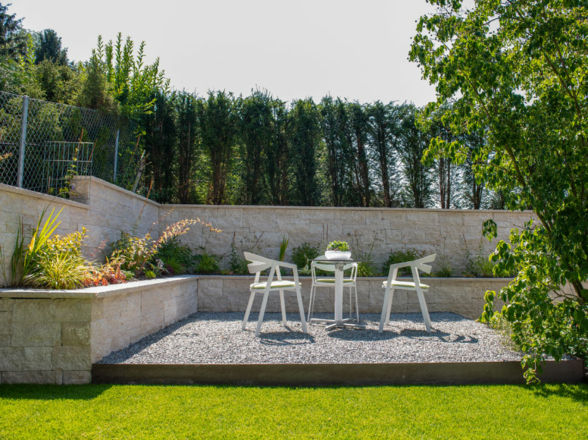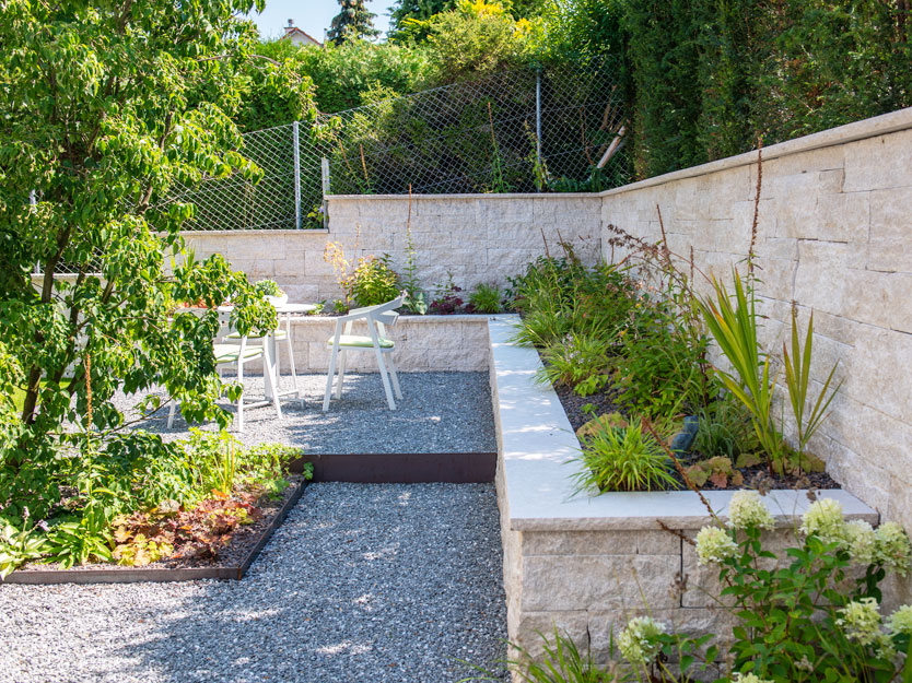 Als wir den Auftrag für diese Neugestaltung erhielten, stiessen wir auf Schotterflächen und eine lieblos gestaltete Böschung. Die Böschung wurde sorgfältig abgetragen und durch eine Natursteinmauer aus kroatischem Kalkstein ersetzt. Um die 2,20 Meter hohe Mauer nicht erdrückend wirken zu lassen, haben wir sie abgetreppt und die Abstufungen mit zahlreichen Blütenstauden bepflanzt, was dem Garten eine lebendige und farbenfrohe Note verleiht.