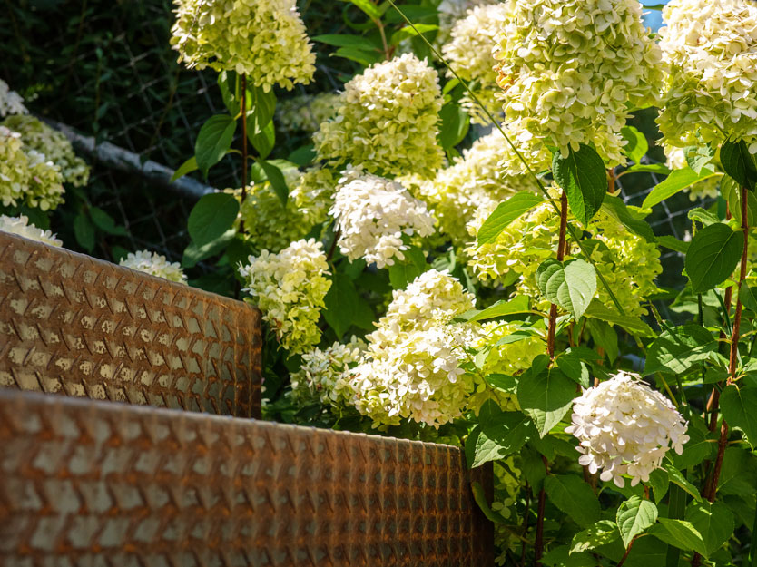 Im vorderen Bereich des Gartens war aufgrund der darunterliegenden Garage zu wenig Bodenaufbau für eine herkömmliche Bepflanzung vorhanden. Um diesem Problem zu begegnen, errichteten wir ein etwa 50 cm hohes Stahlbeet, das mit einer Vielzahl heimischer Stauden bepflanzt wurde. Die auf Mass gefertigte Stahltreppe fügt sich nahtlos in das Design ein und bietet eine elegante Verbindung zum hinter der Eibenhecke liegenden Fussweg. So entstand ein Garten, der nicht nur funktional, sondern auch ästhetisch ansprechend ist und zum Verweilen einlädt.