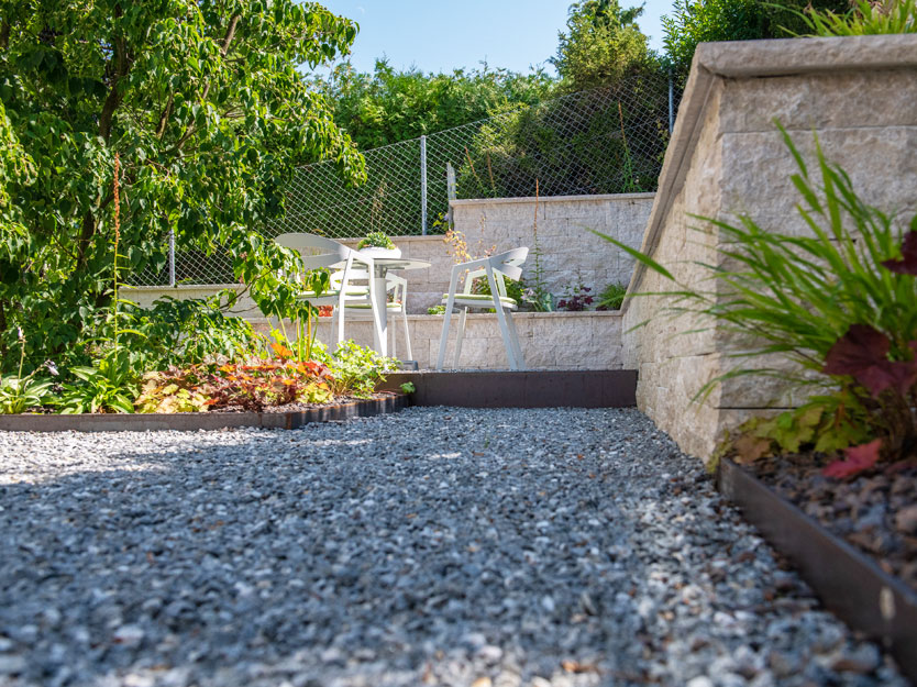 Der Kiesplatz wurde leicht erhöht angelegt, um spannende visuelle Akzente zu setzen. Entlang des oberhalb der Mauer verlaufenden Weges pflanzten wir eine dichte Eibenhecke, die als effektiver Sichtschutz dient. Ein geschickt platzierter, grosser Hartriegel sorgt für eine gemütliche Raumwirkung und schafft einen harmonischen Übergang.